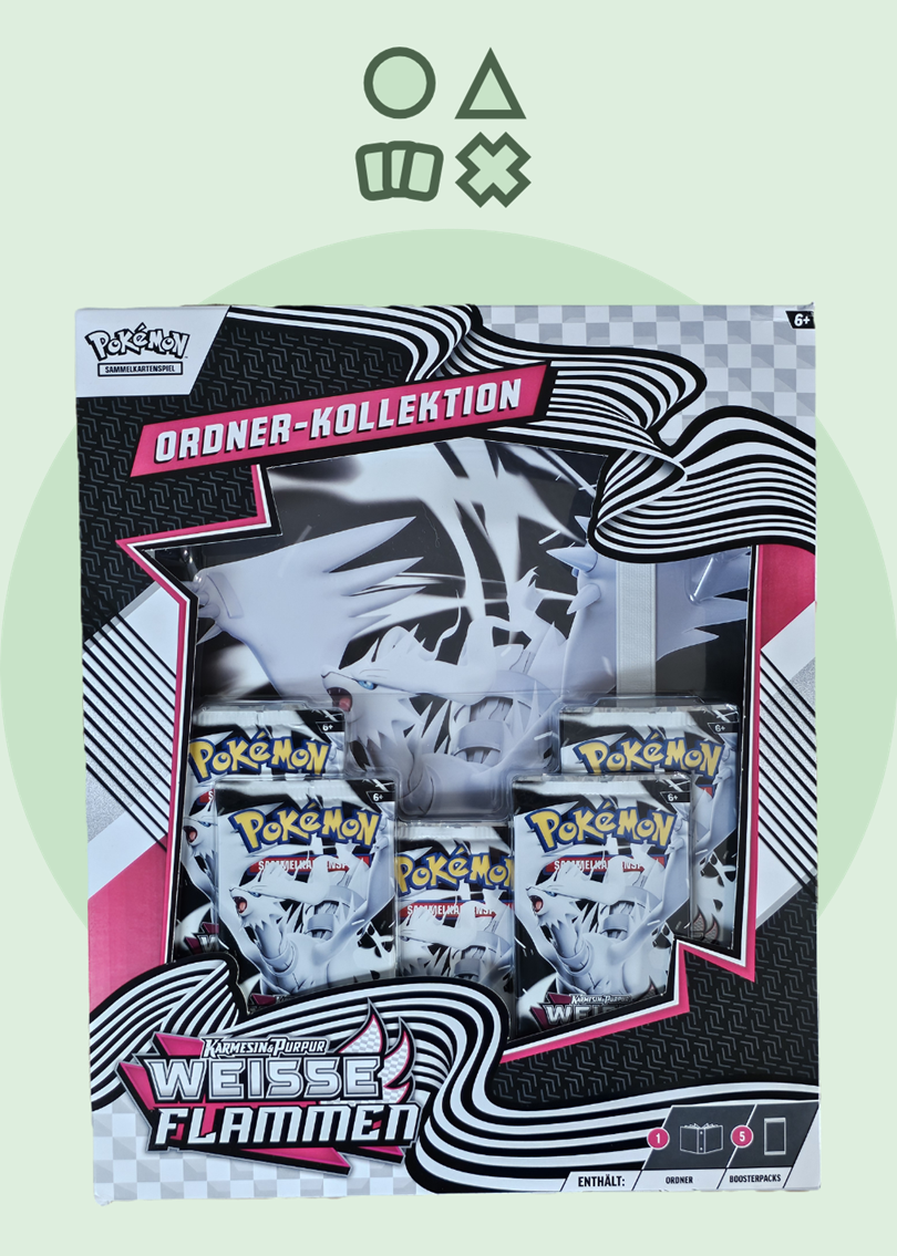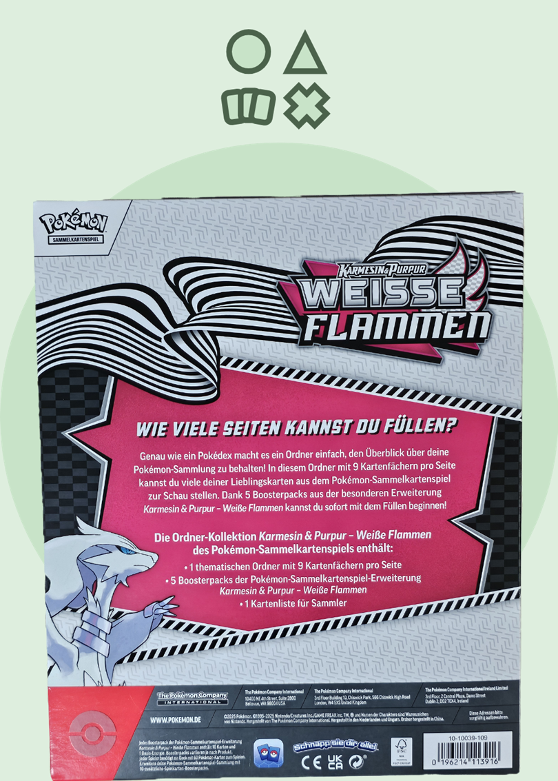 Genau wie ein Pokédex macht es ein Ordner einfach, den Überblick über deine Pokémon-Sammlung zu behalten! In diesem Ordner mit 9 Kartenfächern pro Seite kannst du viele deiner Lieblingskarten aus dem Pokémon-Sammelkartenspiel zur Schau stellen. Dank 5 Boosterpacks aus der besonderen Erweiterung Karmesin & Purpur – Weiße Flammen kannst du sofort mit dem Füllen beginnen!