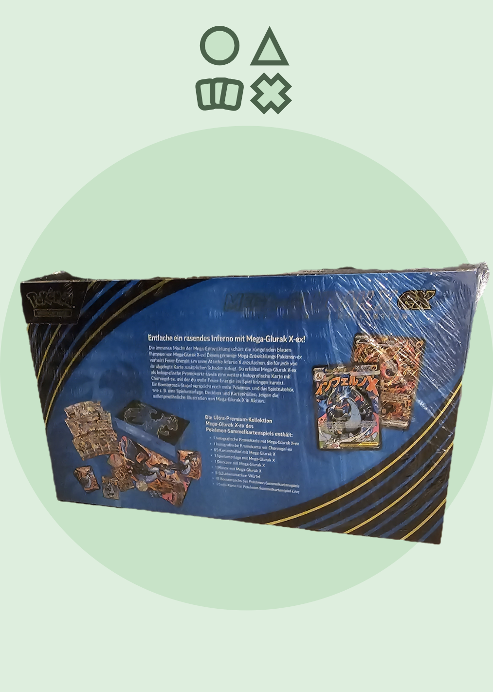 Ein Boosterpack-Stapel verspricht noch mehr Pokémon, und das Spielzubehör, wie z.B. eine Spielunterlage, Deckbox und Kartenhüllen, zeigen die außergewöhnliche Illustration von Mega-Glurak X in Aktion.